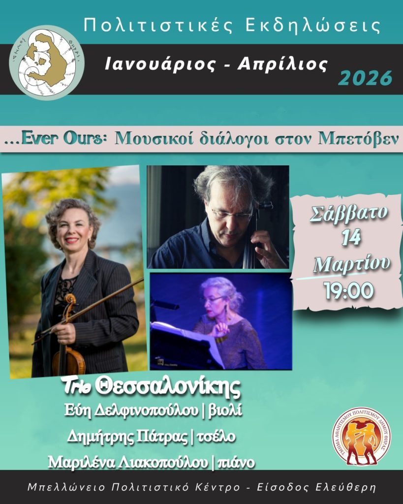 Ο Δήμος Θήρας σας προσκαλεί το Σάββατο 14 Μαρτίου, στις 19:00, στο Μπελλώνειο Πολιτιστικό Κέντρο, στα Φηρά για να παρακολουθήσετε τη συναυλία μουσικής δωματίου από το Τρίο Θεσσαλονίκης με τον τίτλο «…Ever Ours».