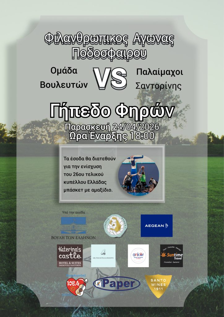 Υπό την αιγίδα της Βουλής των Ελλήνων, ο Δήμος Θήρας διοργανώνει την Παρασκευή 24 Απριλίου 2026, στις 18:00, φιλανθρωπικό ποδοσφαιρικό αγώνα στο γήπεδο των Φηρών, με τη συμμετοχή της Ομάδας των Βουλευτών και των παλαιμάχων ποδοσφαιριστών της Σαντορίνης.
