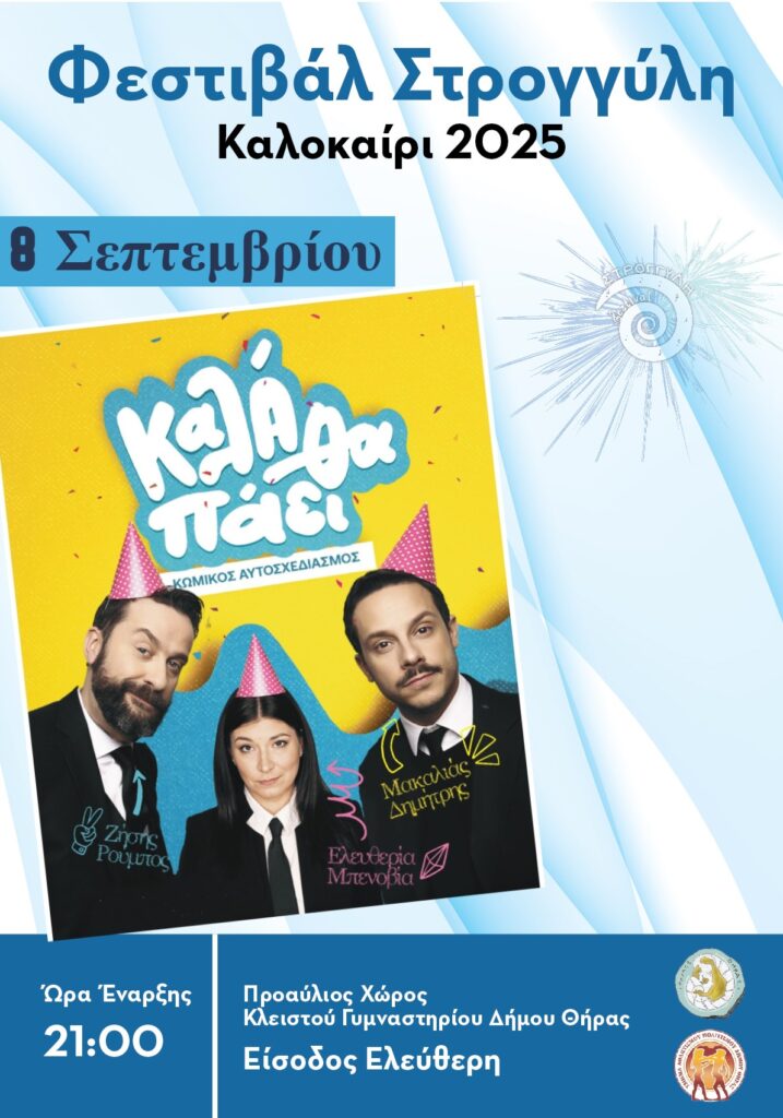 Ο Δημήτρης Μακαλιάς και ο Ζήσης Ρούμπος, μαζί με τη σύμπραξη της Ελευθερίας Μπενοβία, παρουσιάζουν στα πλαίσια του «8ου Φεστιβάλ Στρογγύλη» ένα αυτοσχεδιαστικό comedy show με καταιγιστικό ρυθμό, «καμένο» χιούμορ και ό,τι άλλο αποφασίσει το κοινό, την Δευτέρα 8 Σεπτεμβρίου 2025 στις 21:00 στον Προαύλιο Χώρο του Κλειστού Γυμναστηρίου Δήμου Θήρας.
