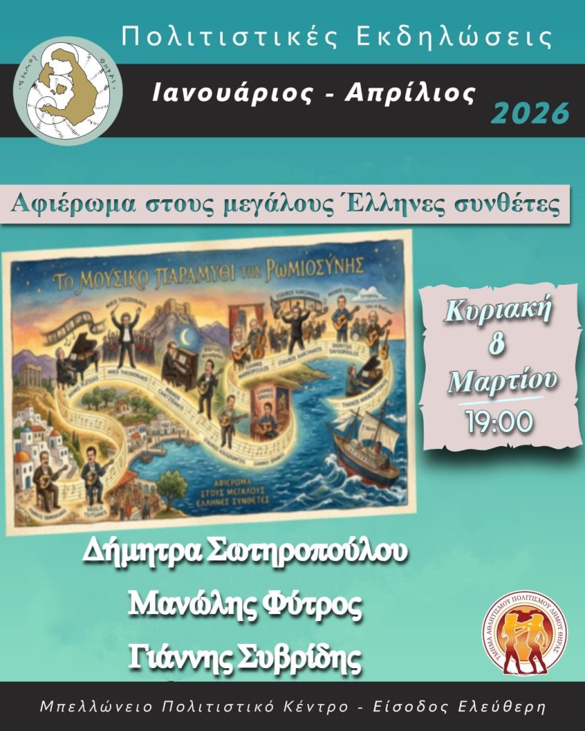 Ο Δήμος Θήρας σας προσκαλεί σε μια ξεχωριστή μουσική παράσταση με τίτλο «Το μουσικό παραμύθι της Ρωμιοσύνης», την Κυριακή 8 Μαρτίου, στις 19:00, στο Μπελλώνειο Πολιτιστικό Κέντρο, στα Φηρά.